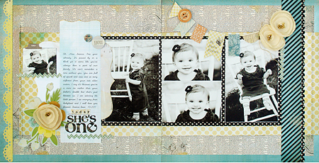 Crinkle it, ink it, paint on it, fold it, sew it, throw glitter on it, CHANGE IT UP. This helps with those large graphics, too. Cut a strip through a graphic, pleat it, distress it... no one knows you started with a bicycle or a bunch of flowers. Here are a few examples... and I won't admit that I used paint and stuff because the paper scared me. Because what if you really loved that paper and are now offended that I didn't? *wink* But I will say up front... these two layouts? I ended up loving them.